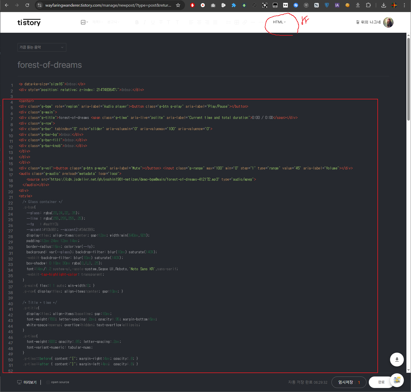 복사한 코드를 html 코드 형식으로 바꾸고 복사붙여넣기를 하고 완료를 누른다.