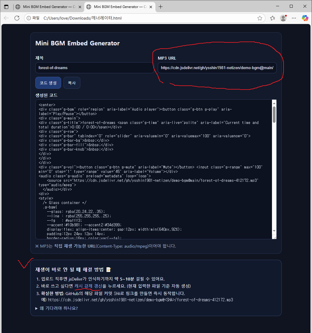 그럴땐 아까 깃헙 mp3 링크를 url 넣는곳에 넣고, 아래 캐시 강제 갱신을 눌러주고 하면된다.